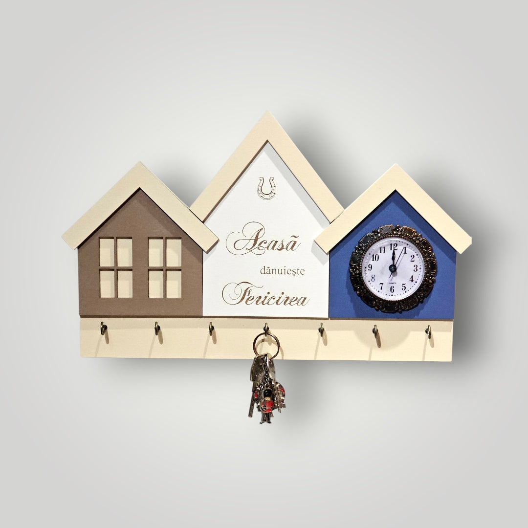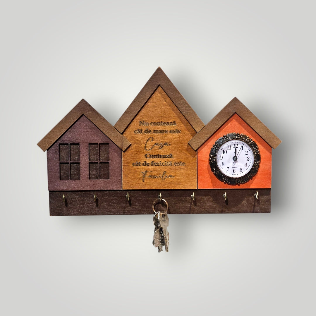 Nu îți mai pierde timpul căutând cheile! Această Căsuță cu Ceas Integrat este accesoriul inteligent care combină soluția perfectă de depozitare cu utilitatea unui ceas de perete. Este ideală pentru hol, birou sau bucătărie.